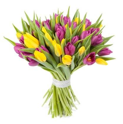 Букет из множества ярких тюльпанов – прекрасный способ выразить своё расположение и подарить шикарное настроение возлюбленной, близким друзьям или коллеге по работе. Цветы подойдут для праздника, извинения или просто в виде приятного ненавязчивого жеста, дарящего приподнятое настроение. Фиолетовый цвет покажет уважение и преданность, а желтый принесет лучики солнца в жизнь близкого человека.